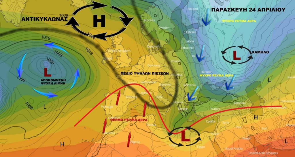 Το πεδίο υψηλών πιέσεων θα επεκταθεί και πιο νοτιοανατολικά προς κεντρική Μεσόγειο περιοχή Ιταλίας. Αυτή η επέκταση θα έχει ως αποτέλεσμα την κάθοδο Αυλώνα ψυχρού ρεύματος(δεν θα είναι έντονο αυτό το ψυχρό ρεύμα αέρα) προς Ιταλία και Ελλάδα την Παρασκευή που αυτό θα ευνοήσει σε πιο θερμό ρεύμα αέρα από Αφρική να ανηφορίσει προς την ανατολική Μεσόγειο που είναι η Κύπρος για αυτό Παρασκευή και Σάββατο μέχρι και Κυριακή θα έχουμε περαιτέρω άνοδο θερμοκρασίας για να προσεγγίσουμε τους 27-29 βαθμούς σε εσωτερικά και ημιορεινά τμήματα του νησιού μας χωρίς να αποκλείεται πιο τοπικά και τους 30 βαθμούς.