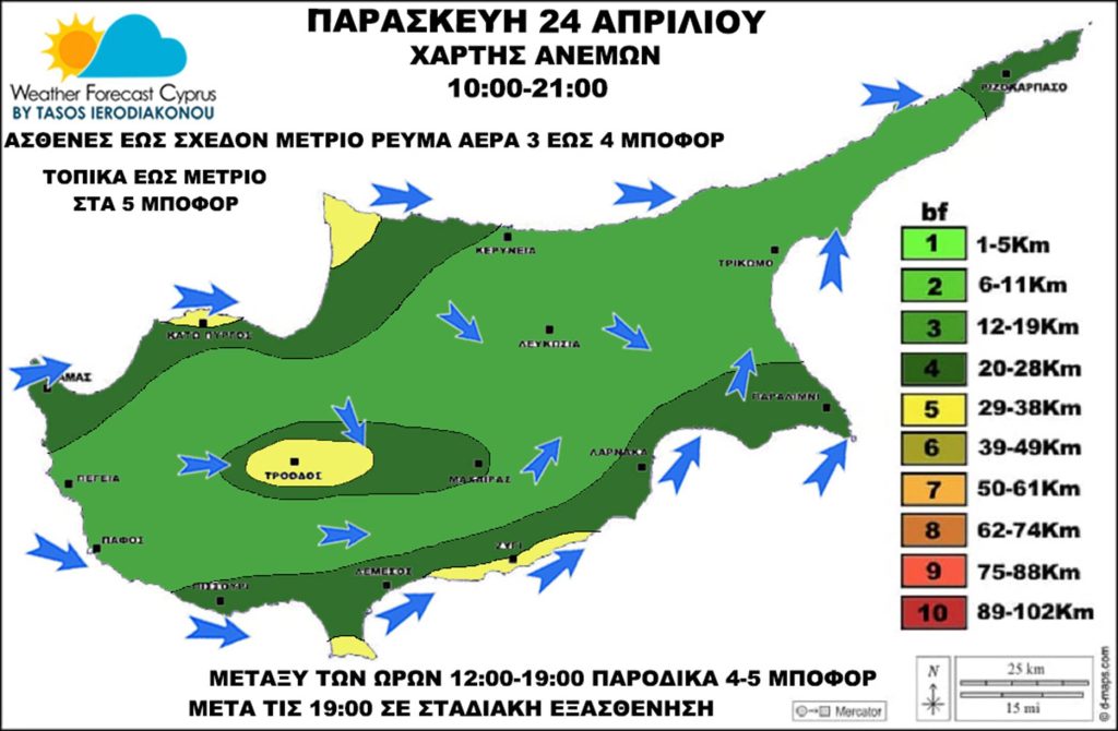 Βόρειο-Βορειοανατολικό το πεδίο ανέμων ασθενές έως σχεδόν μέτριο ρεύμα αέρα 3 έως 4 μποφόρ και παροδικά έως μέτριο ρεύμα αέρα στα 5 μποφόρ μεσημέρι προς απόγευμα σε βορειοδυτικά και νότια-νοτιοανατολικά παράκτια τμήματα. Βραδινές ώρες Βόρειο-Βορειοδυτικό το πεδίο ανέμων πολύ ασθενές ρεύμα αέρα έως 2 μποφόρ μέσα στο νησί αλλά παροδικά στα παράκτια έως ασθενές ρεύμα στα 3 μποφόρ και στα δυτικά-ανατολικά-νοτιοανατολικά παράκτια και έως 4 μποφόρ.