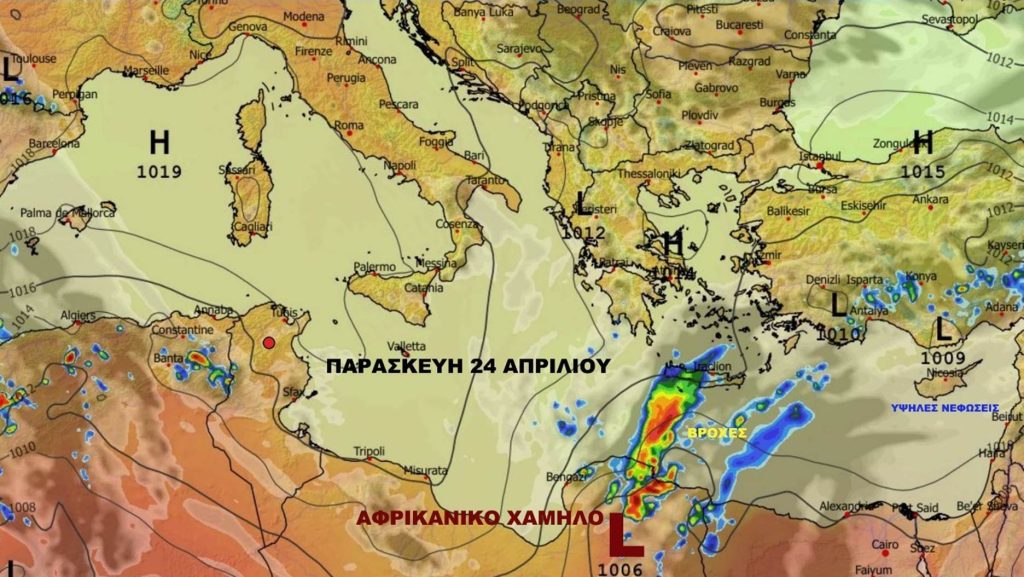 Παρασκευή 24 Απριλίου Ασθενής χαμηλή πίεση θα επηρεάζει την περιοχή μας χωρίς όμως ιδιαίτερη αστάθεια. Καιρικές συνθήκες με ηλιοφάνεια και παροδικές νεφώσεις τοπικά αυξημένες χωρίς να αποκλείεται πολύ τοπικά για βροχή-σκονοβροχή στα ορεινά μεσημβρινές ώρες αλλά δεν φαίνεται κάτι το ιδιαίτερο. Βραδινές ώρες παροδικές νεφώσεις. Το αφρικάνικο χαμηλό βαρομετρικό βρίσκεται στη Λιβύη με βροχές και σκόνη και σταδιακά θα εισέλθει στο θαλάσσιο χώρο.