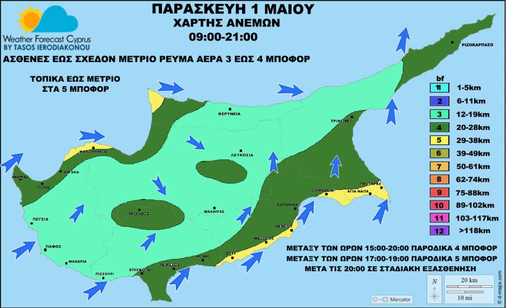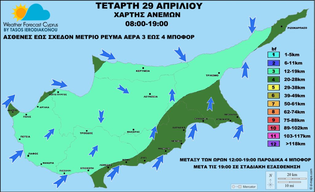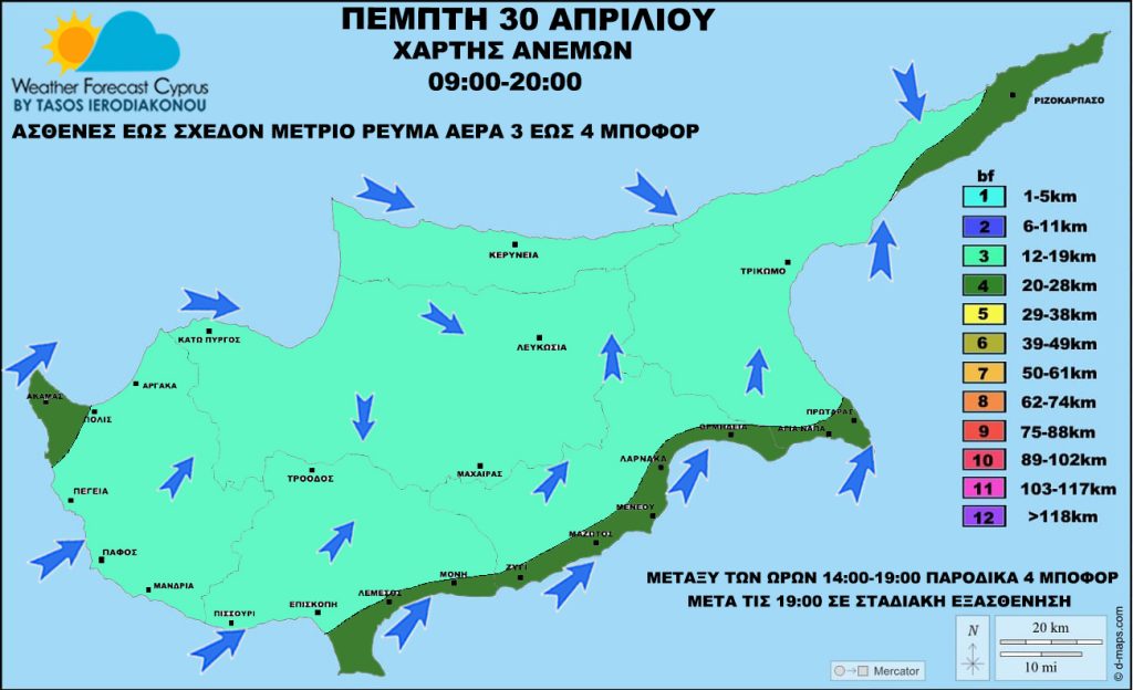 Κατά την διάρκεια της ημέρας το πεδίο ανέμων θα είναι κυρίως ασθενές έως σχεδόν μέτριο ρεύμα αέρα δηλαδή 3 έως 4 μποφόρ(σε χιλιόμετρα μπορείτε να το βλέπετε δεξιά του χάρτη). Πολύ τοπικά και μικρής διάρκειας έως μέτριο ρεύμα αέρα στα 5 μποφόρ την Τρίτη. Ενισχύεται λίγο περισσότερο την Παρασκευή 1 Μάιου για να φτάνει σε περισσότερες περιοχές έως 5 μποφόρ κυρίως παράκτιες.